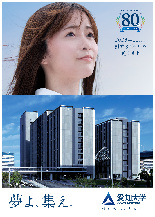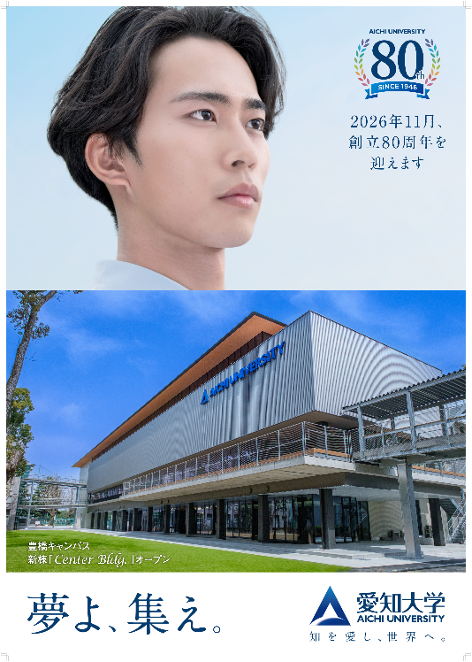 愛知大学のブランドスローガン「知を愛し、世界へ。」を継続するとともに、キャッチコピーに「夢よ、集え。」を採用しました。「夢よ、集え。」には、愛知⼤学に学ぶ学⽣のあらゆる「夢」を共に実現していきたい、という意味を込めています。多様で複雑化する国際問題、社会課題の解決に貢献できる可能性に満ちており、愛知⼤学には、それぞれの夢や想いを実現できる場があります。