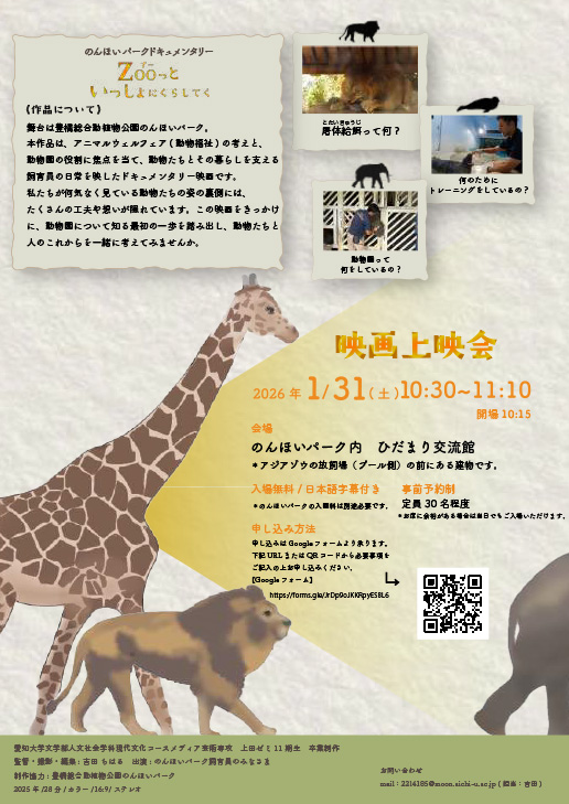 <1/31・要申込>【上田ゼミ制作】のんほいパークで映像作品の上映会が開催されます