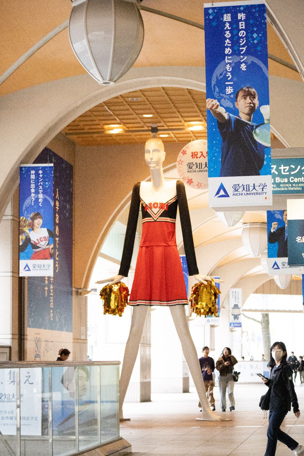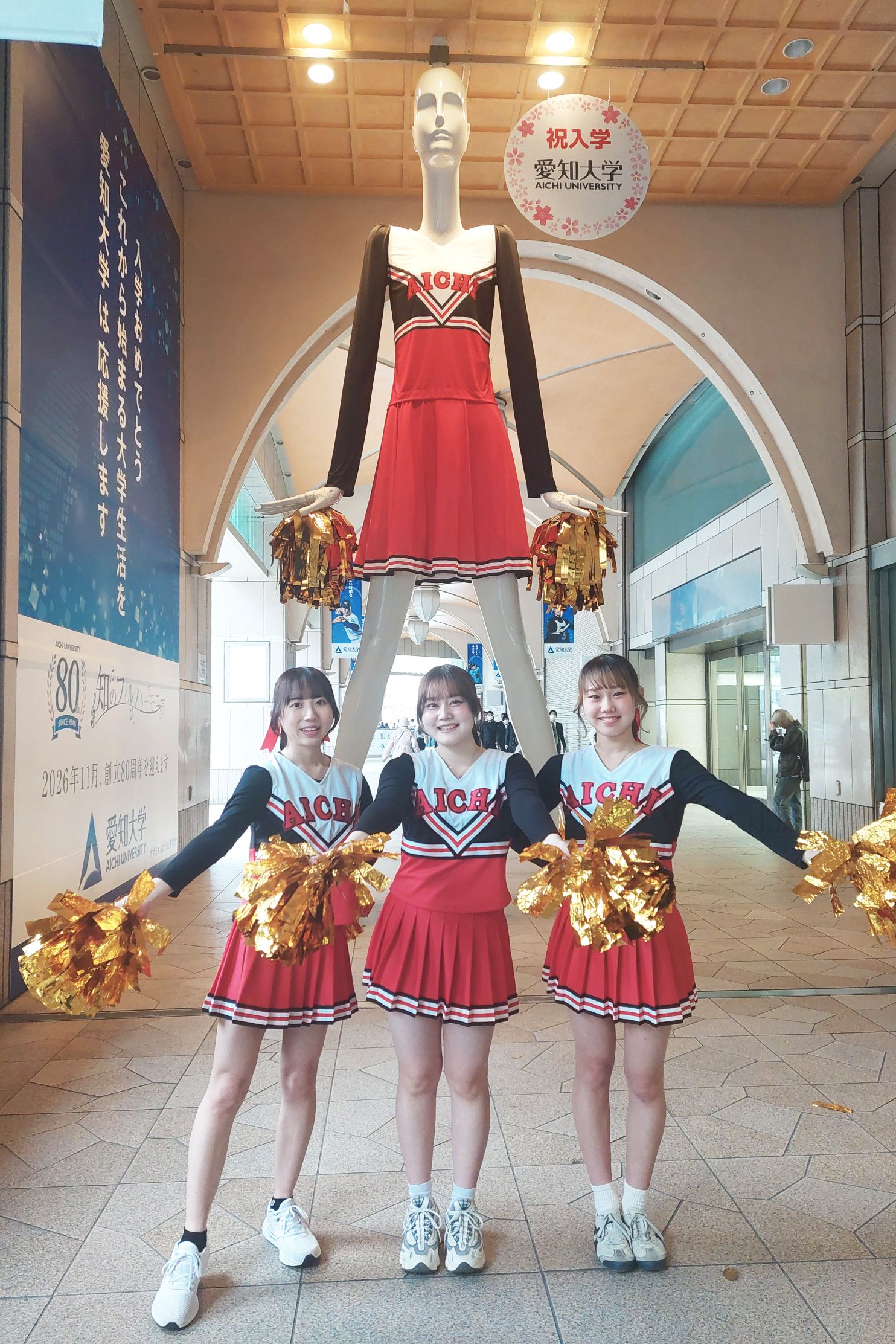 新入生にエールを送るというコンセプトで、愛知大学のチアリーダーのユニホームに着替えたナナちゃんが登場。