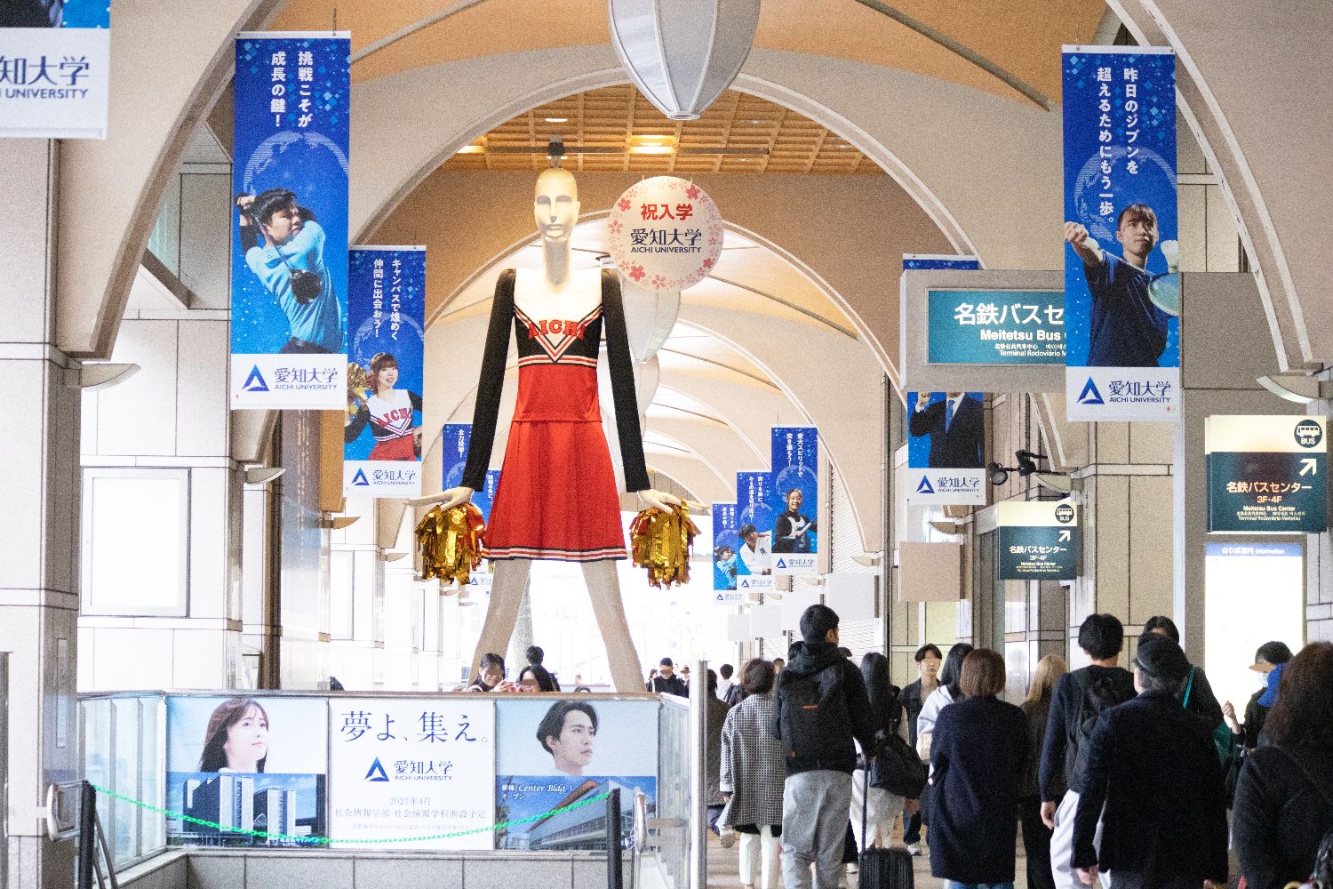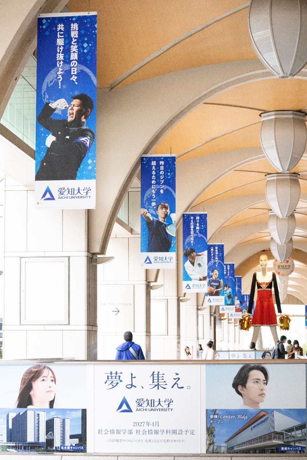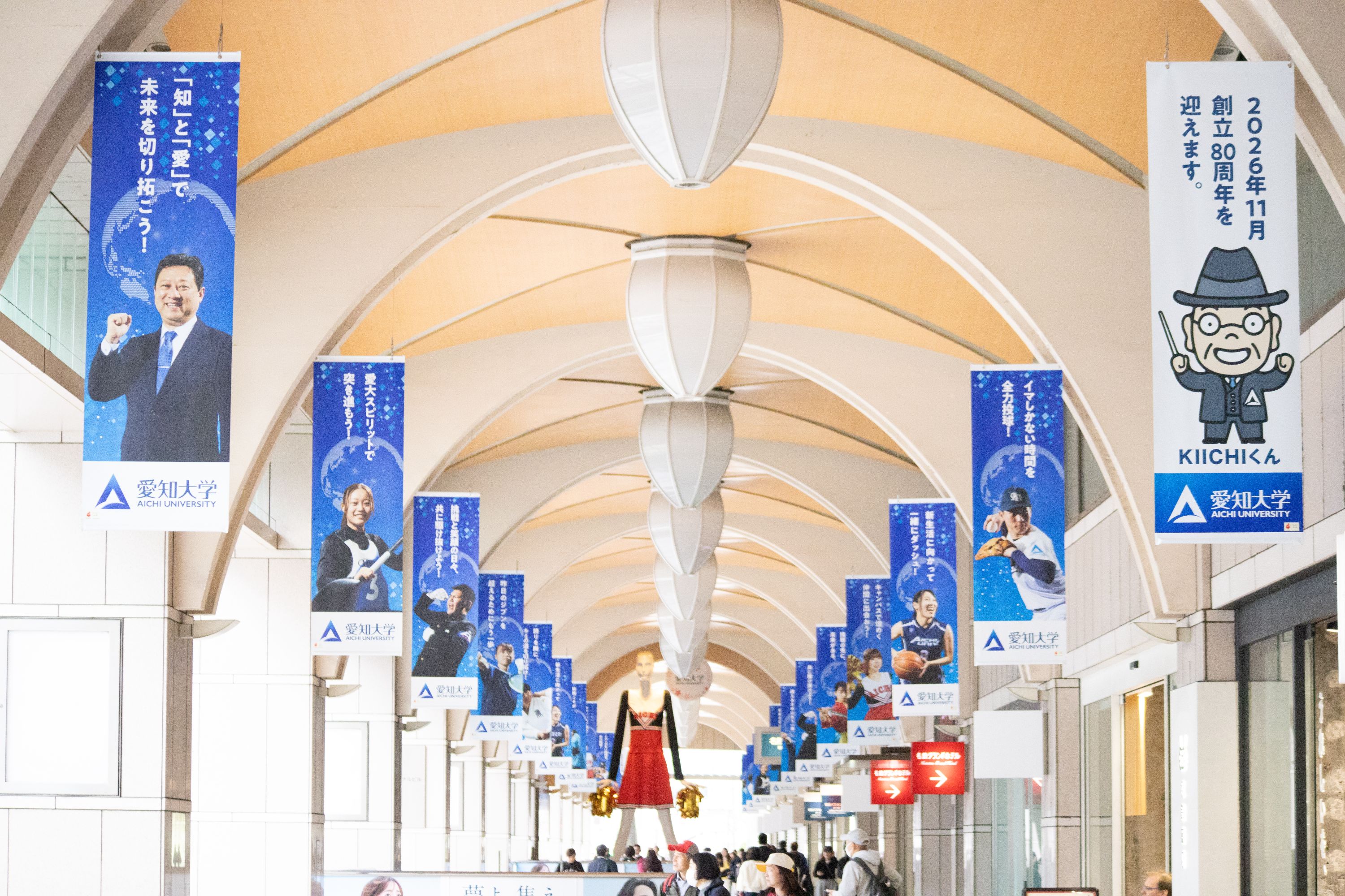 周囲のバナーには、クラブで活動している学生と学長のメッセージ、愛知大学公式マスコットキャラクター「KIICHIくん」で盛り上げます。