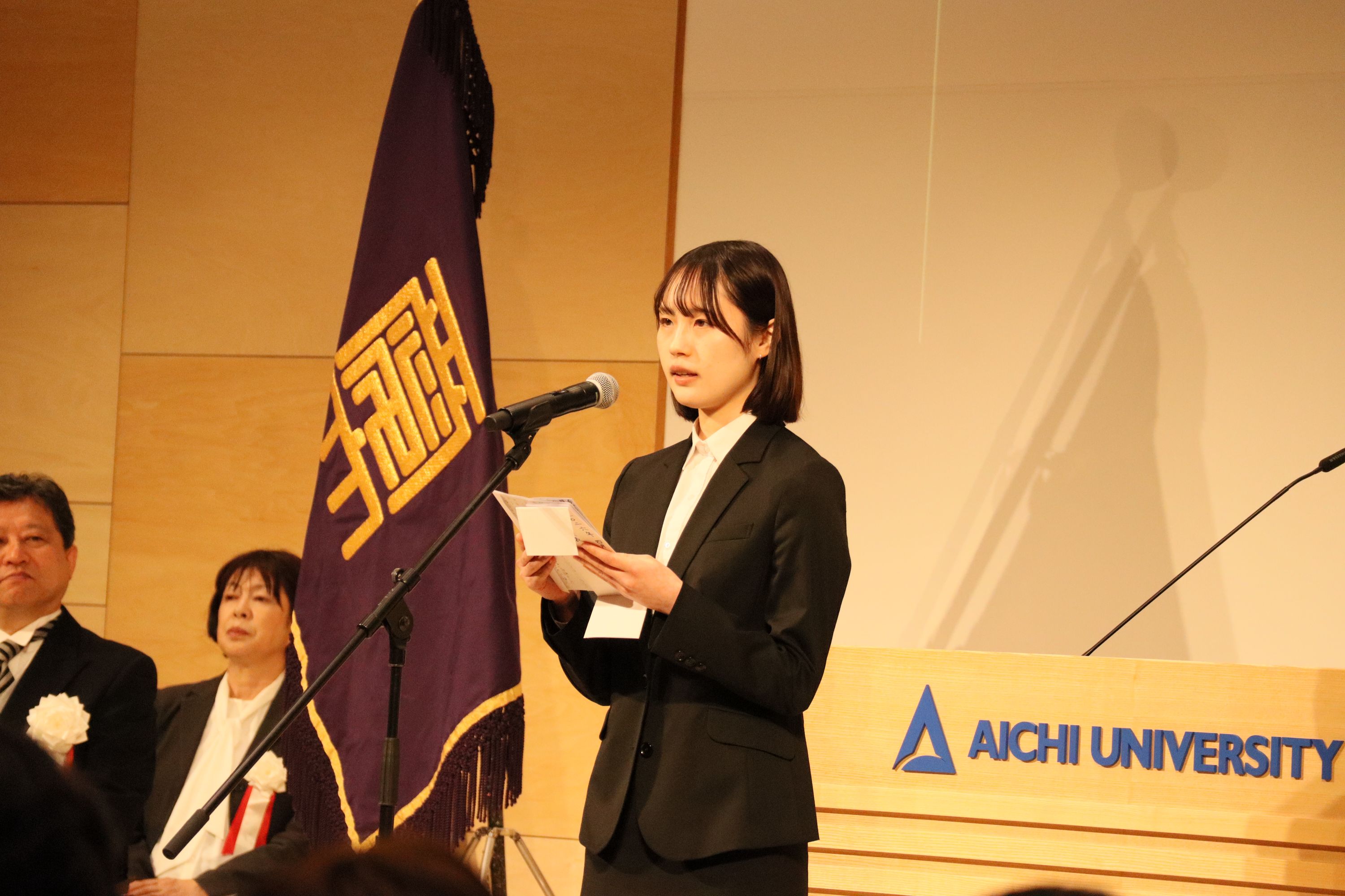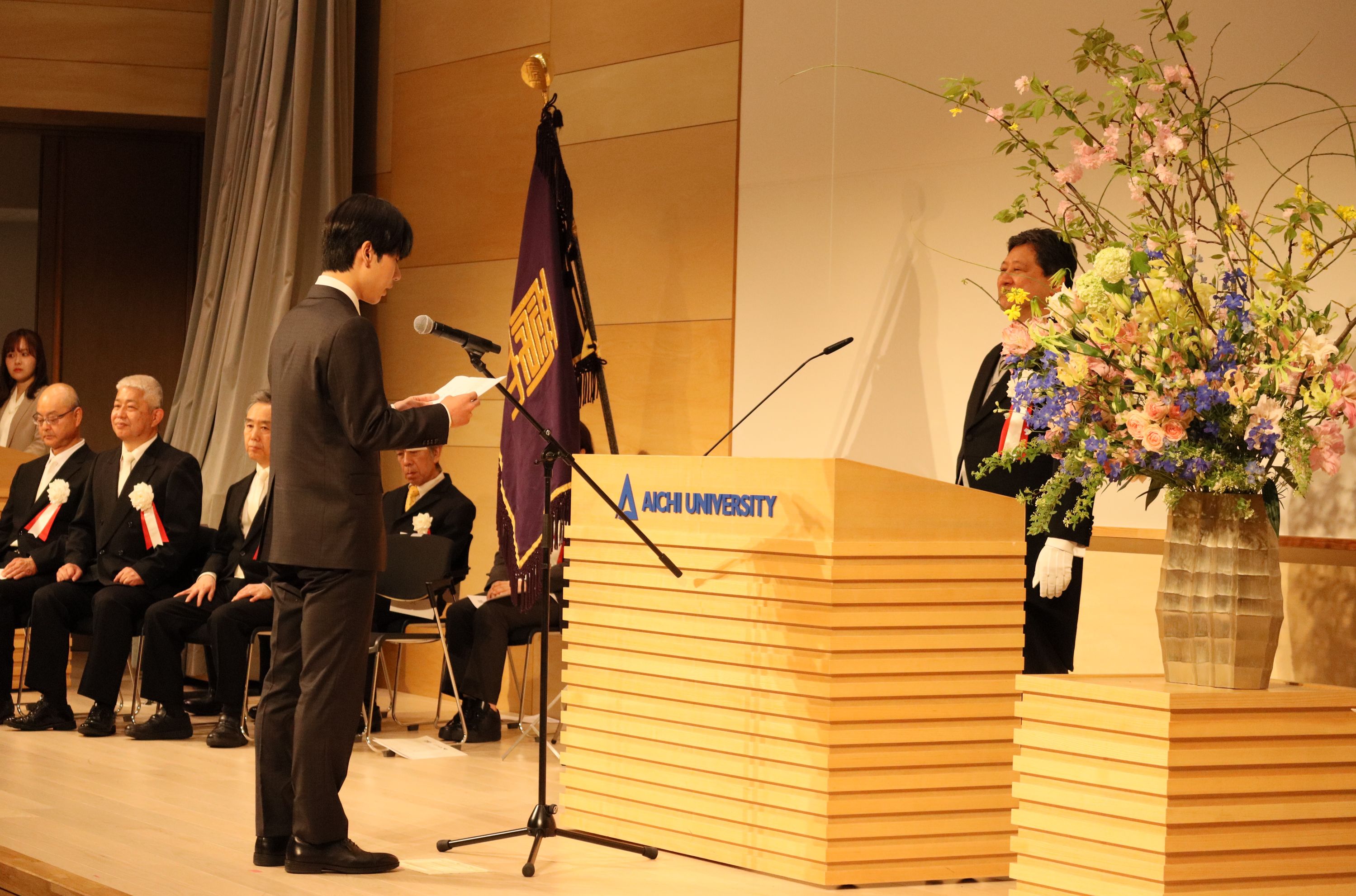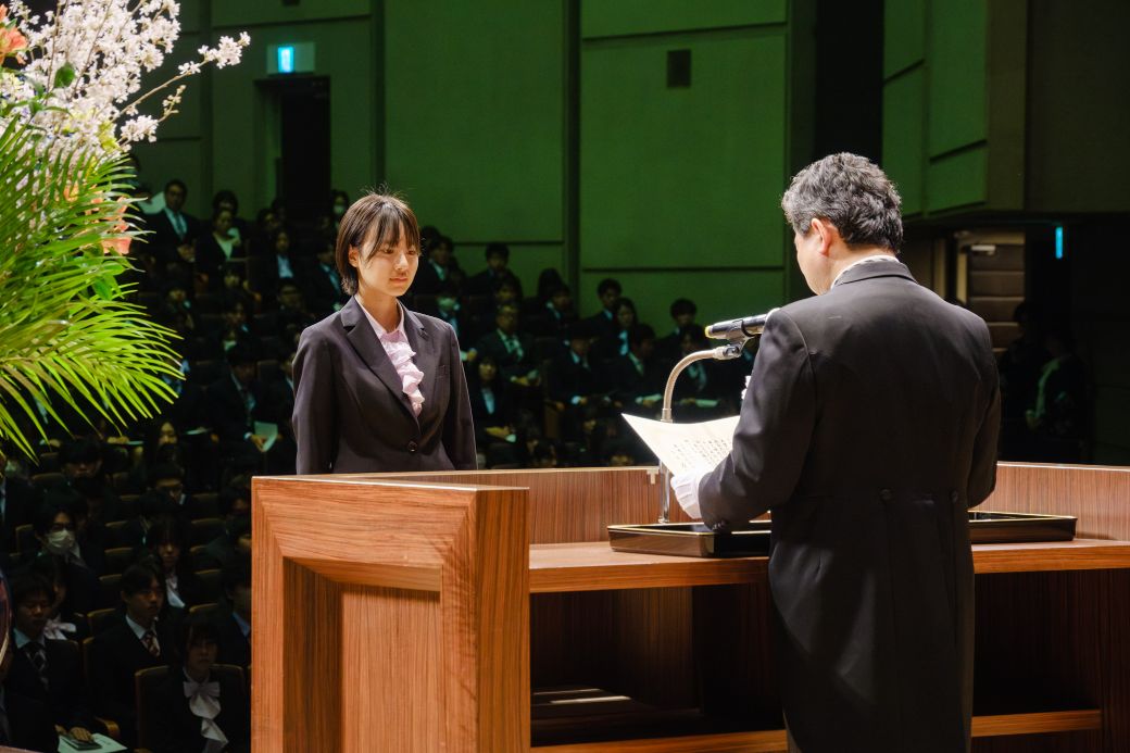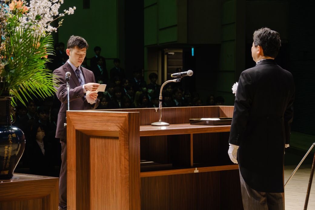 学長告辞、来賓祝辞を受け、新入生の代表者から力強い「新入生宣誓」があり、次に在学生の代表者が「歓迎の辞」を述べ、東亜同文書院記念基金特別奨励賞の授与後、入学式が終了しました。