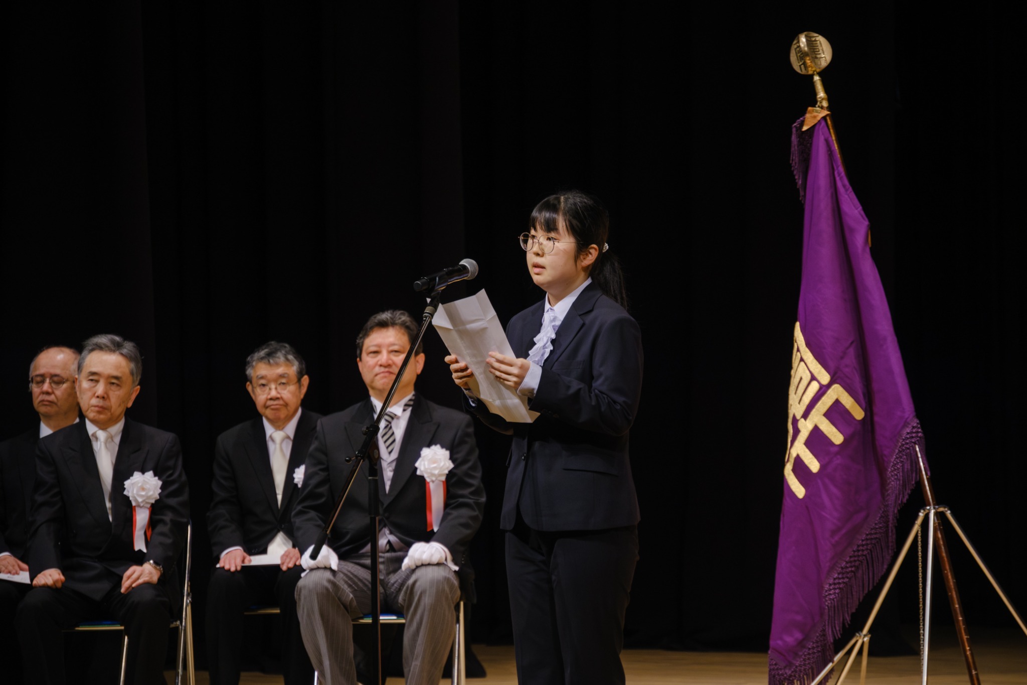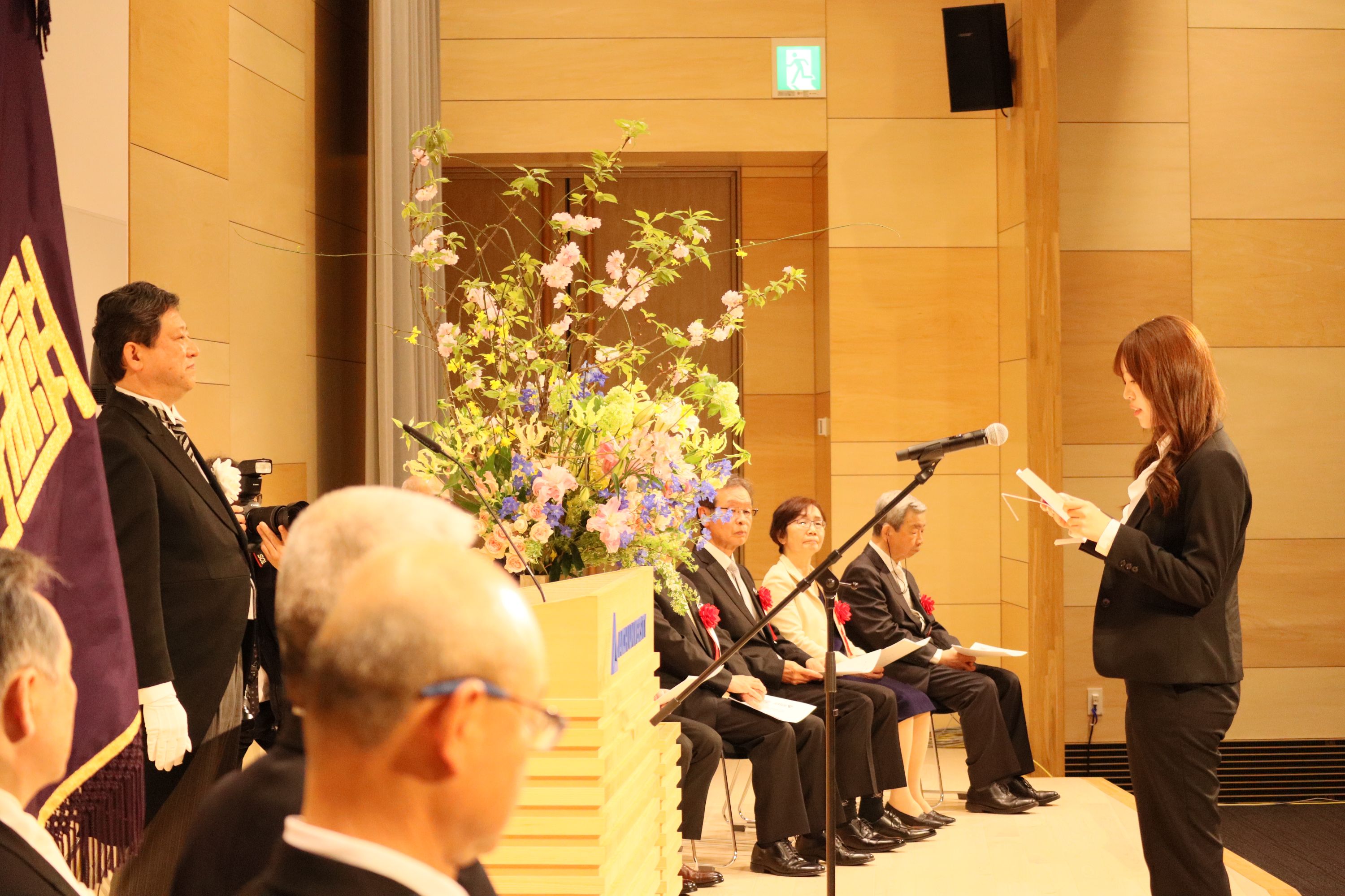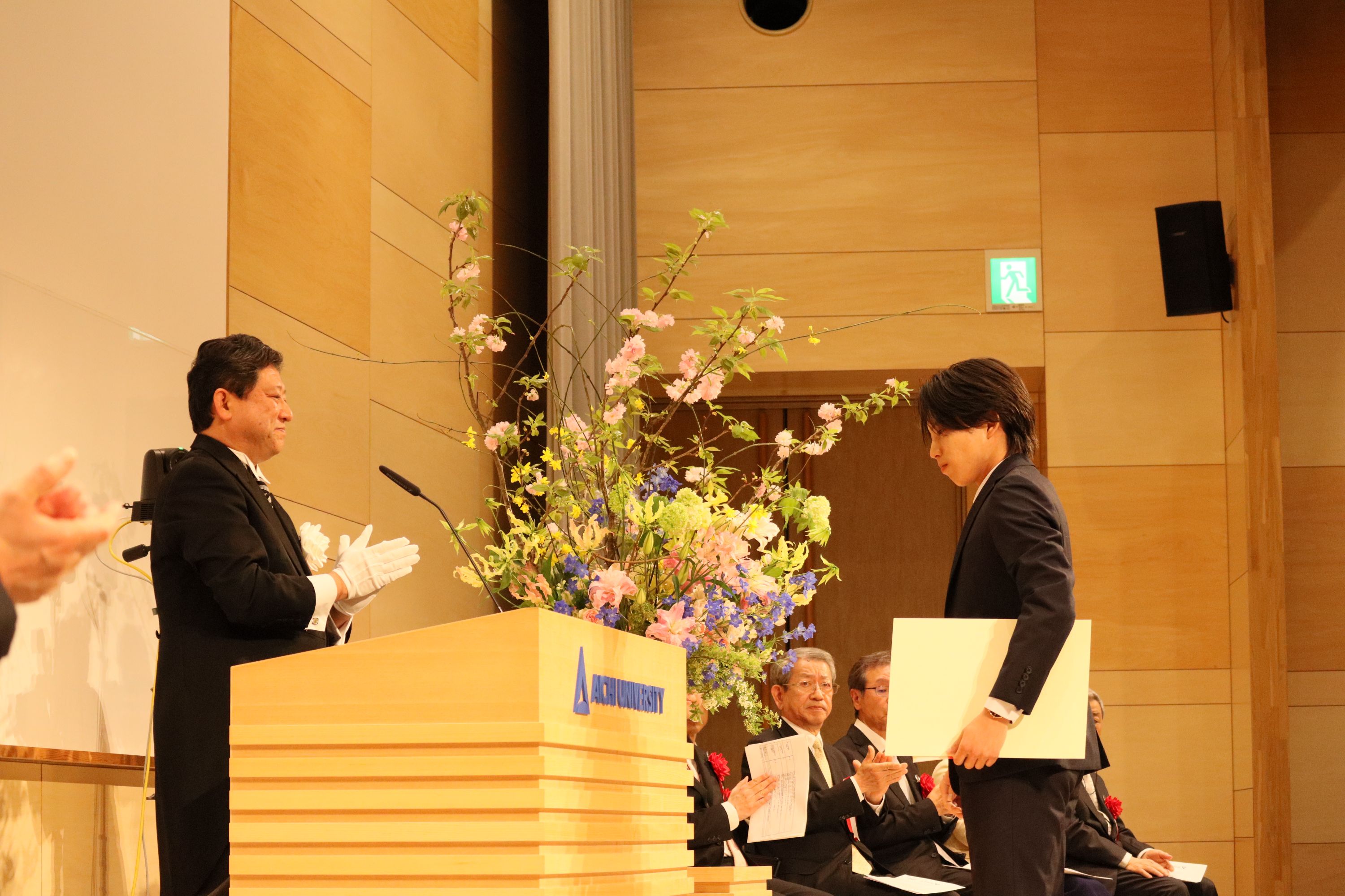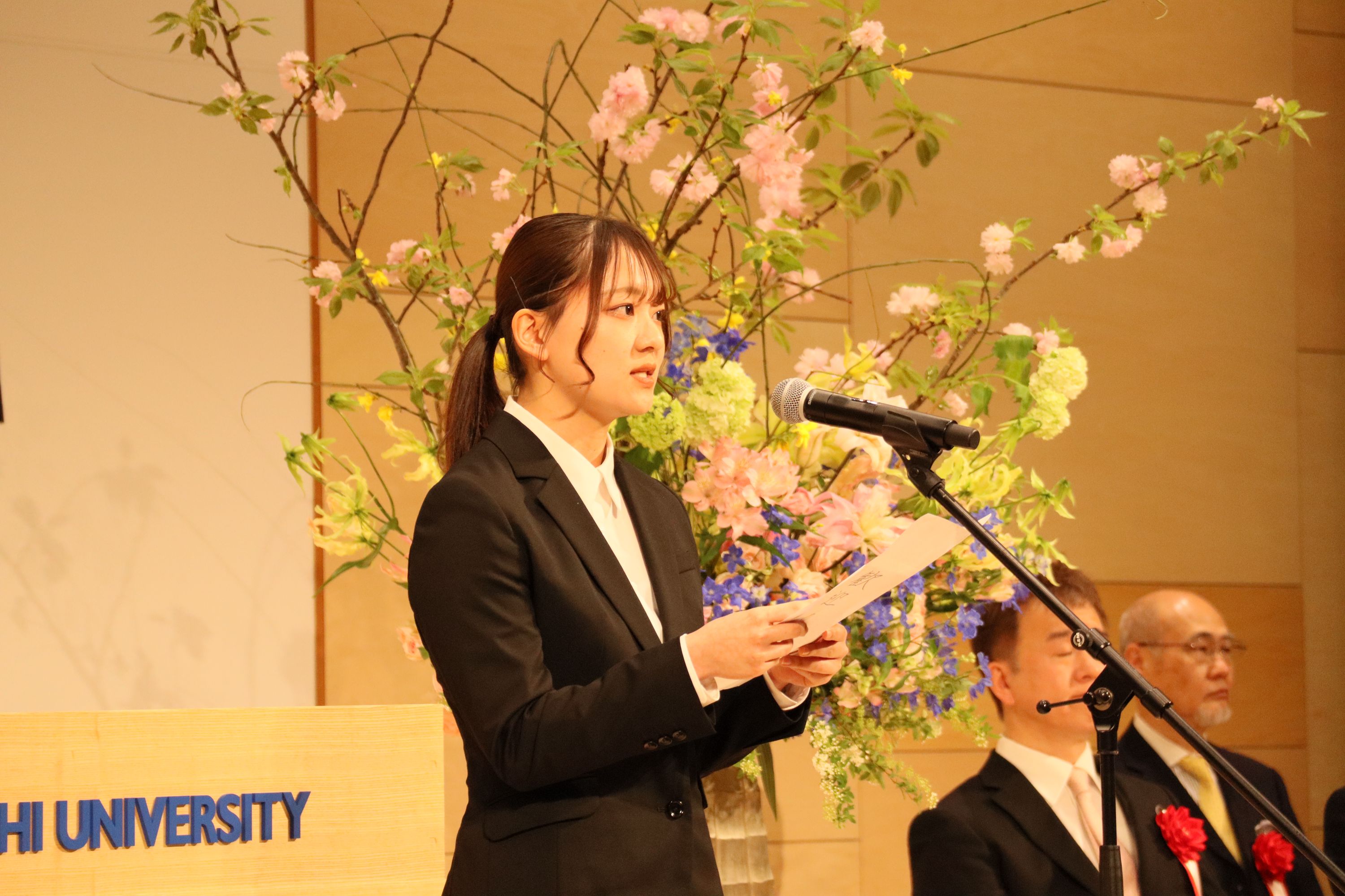 学長告辞、来賓祝辞を受け、新入生の代表者から力強い「新入生宣誓」があり、次に在学生の代表者が「歓迎の辞」を述べ、東亜同文書院記念基金特別奨励賞の授与後、入学式が終了しました。