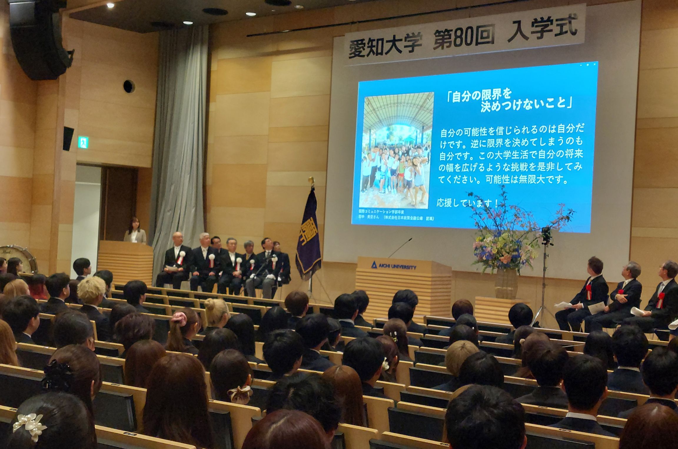 式典の最後には、今年3月に本学を卒業した先輩方から新入生の皆さんへ向けた応援のビデオメッセージが届きました。