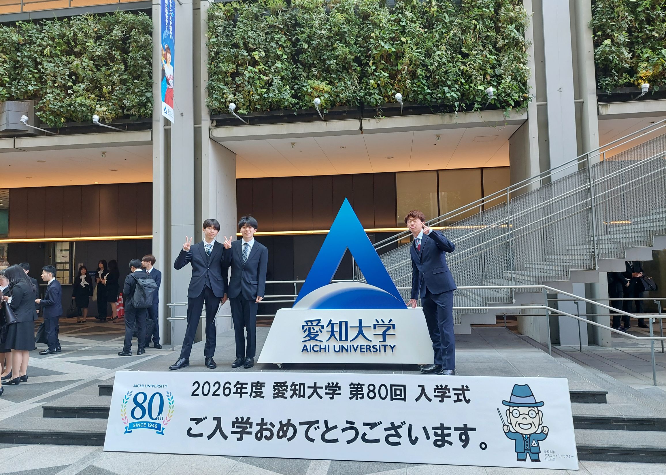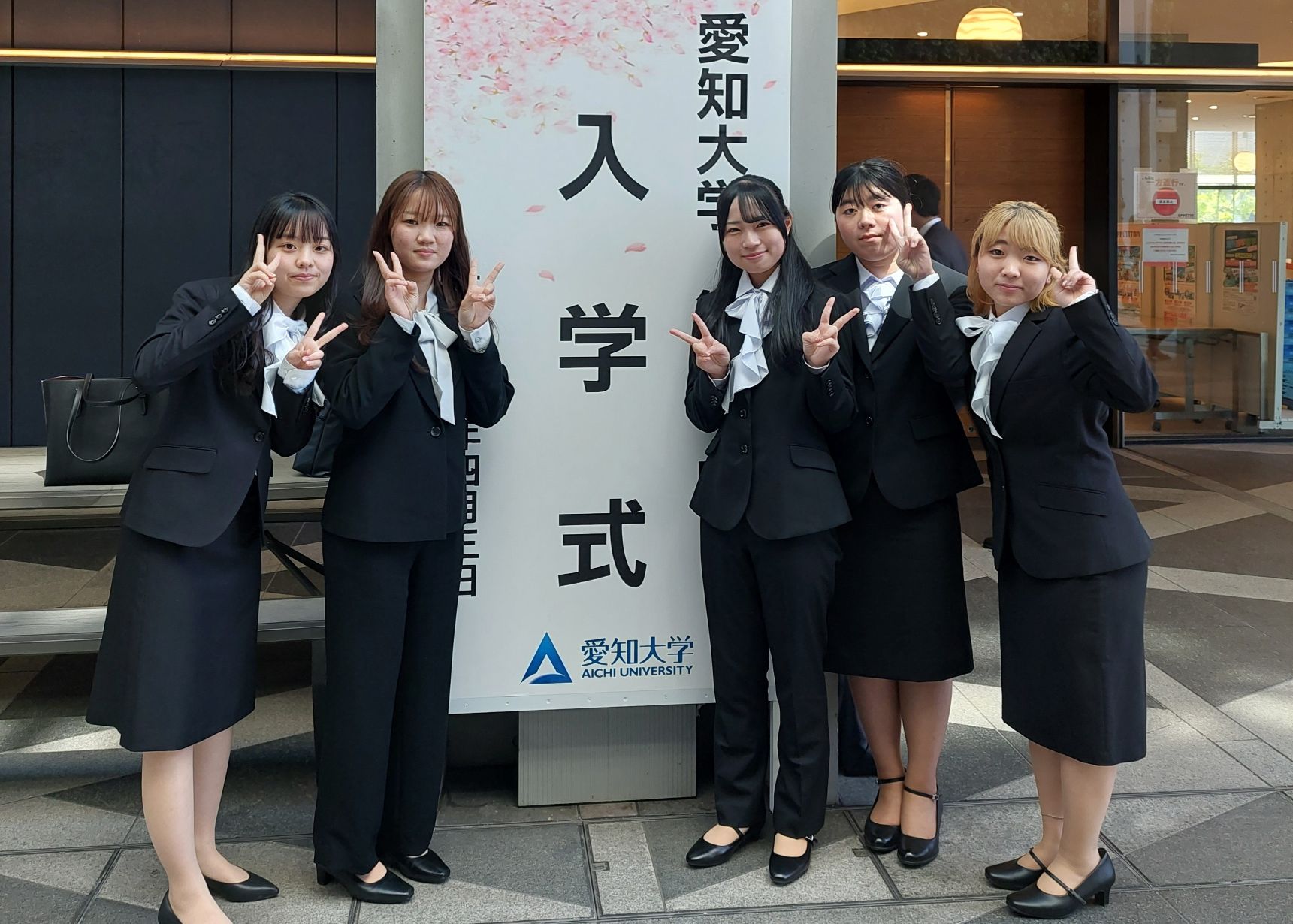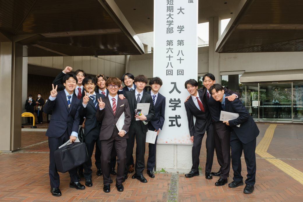 式の開会前や閉会後には、入学式の立て看板前で家族や友人らと記念撮影する新入生が長い行列を作り、記念写真を撮る新入生が目立ちました。