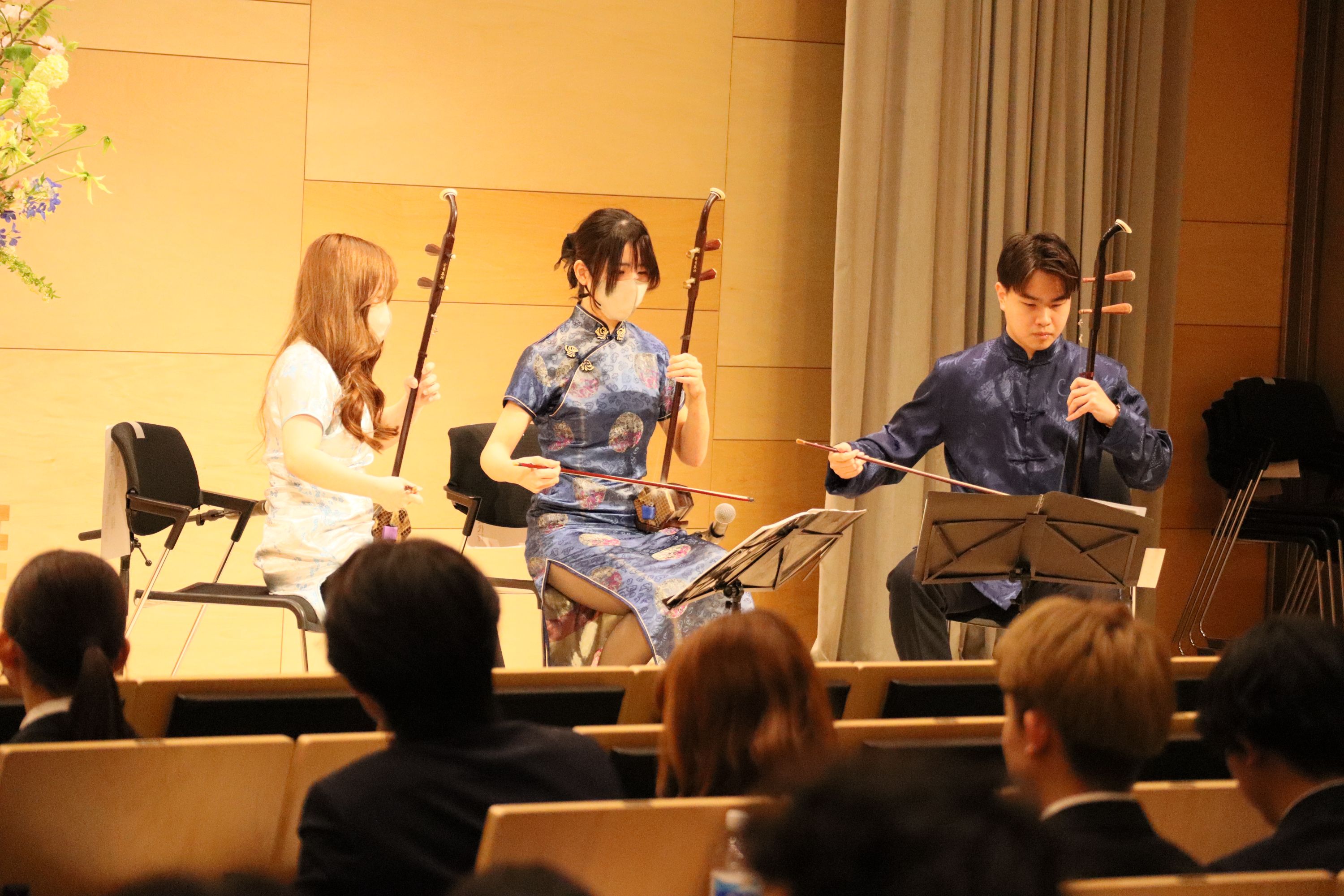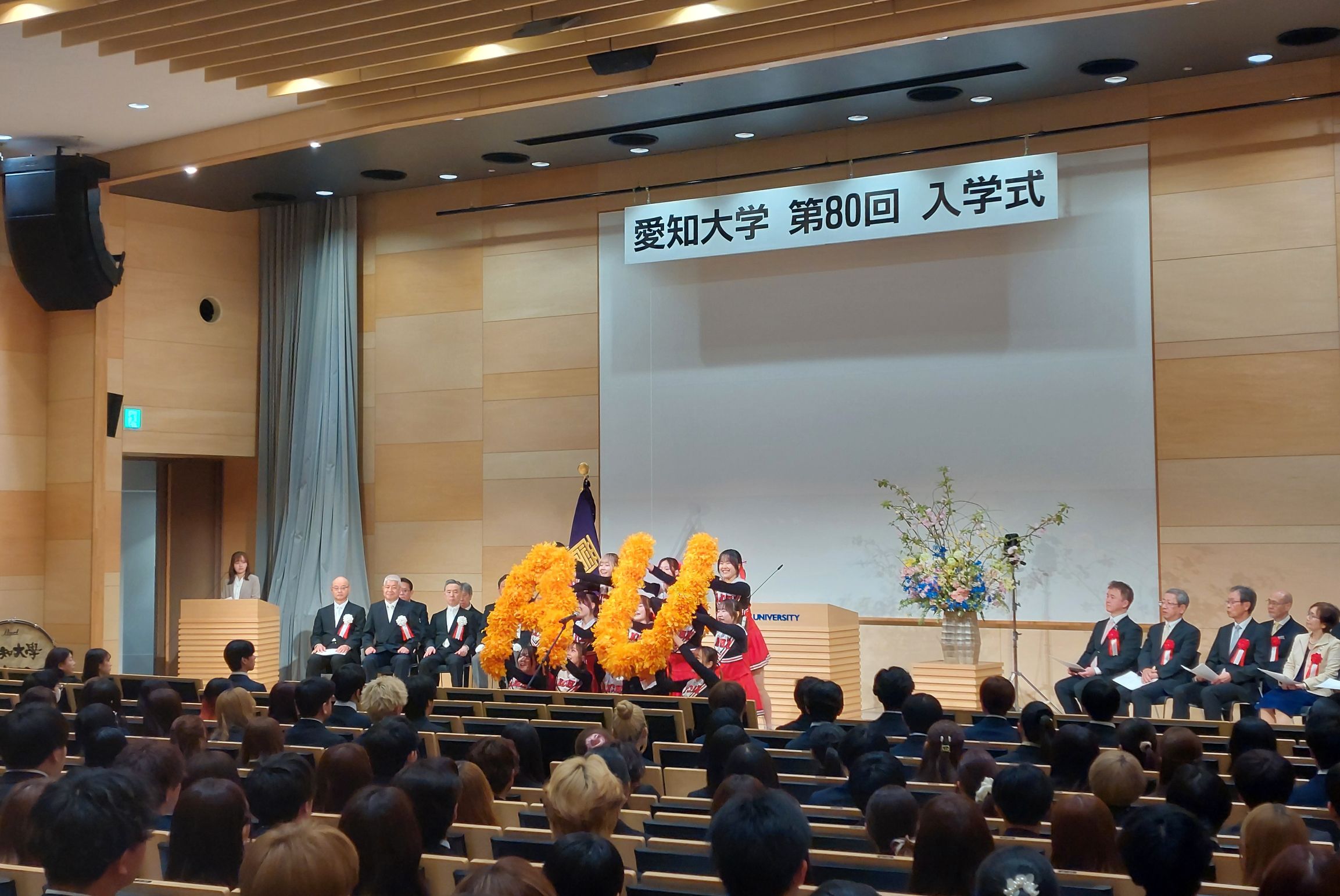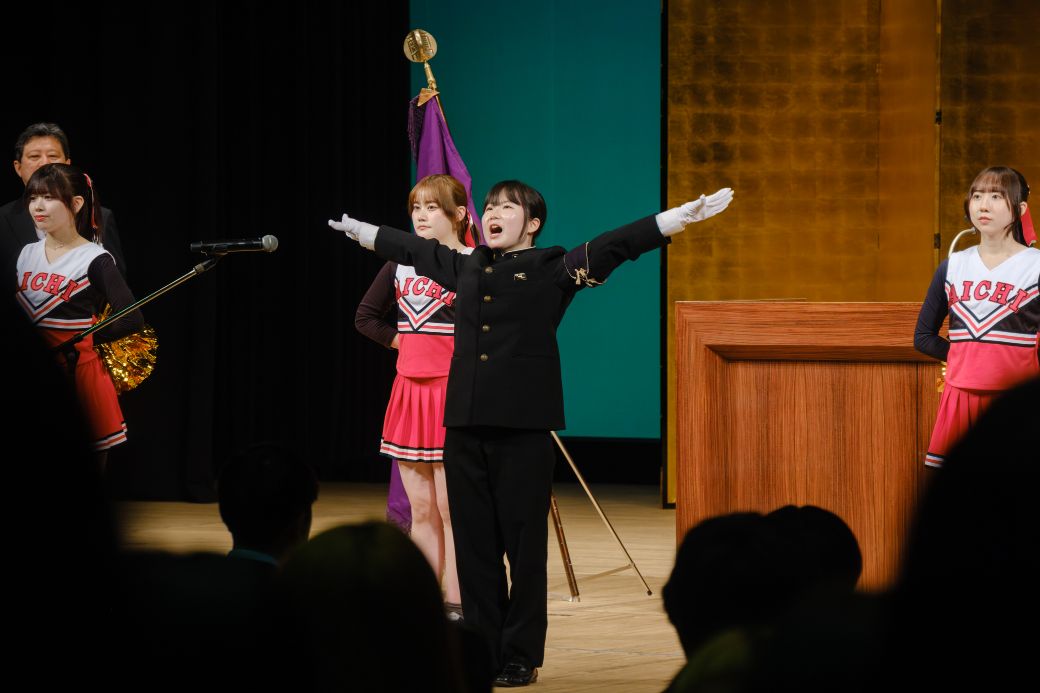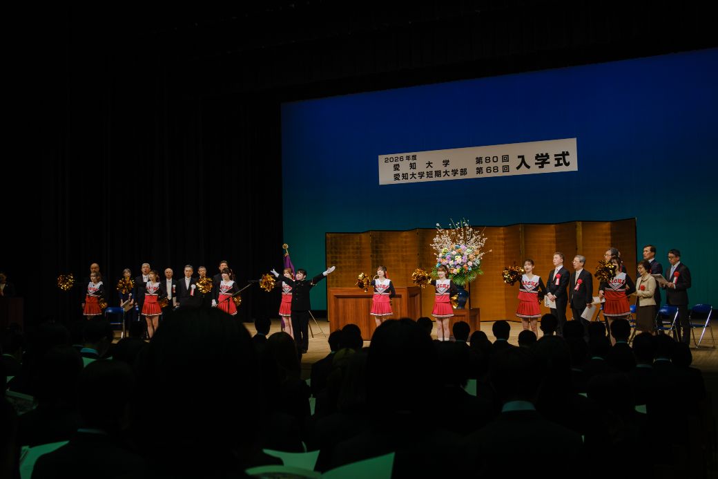 式典の開会前には二胡部(名古屋キャンパス)と吹奏楽部(豊橋キャンパス)による演奏で新入生を迎え、式典中には應援團チアリーディング部の演舞や、應援團リーダー部による学生歌斉唱、新入生へのエールが送られました。