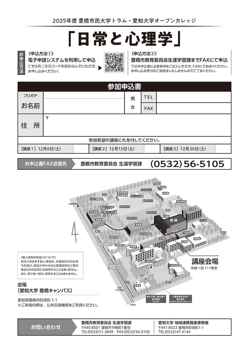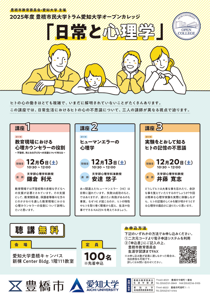 2025年度 豊橋市民大学トラム愛知大学オープンカレッジ「日常と心理学」を開催いたします。