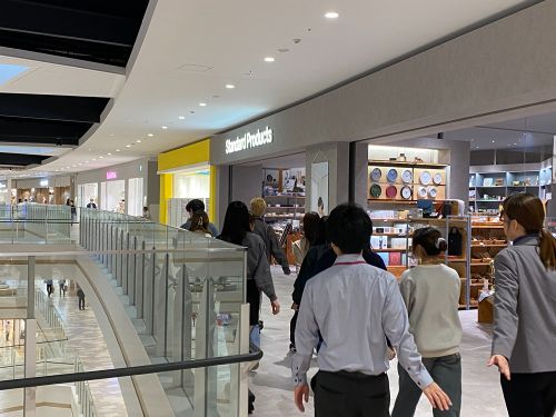 私たちイベントチームは、まず実際に会場となる1階の「こもれびコート」を下見し、会場の広さや周囲のテナント構成などを確認しました。服の専門店が多いことから、「使わない布をリメイクするワークショップ」をテーマに、小物づくりを通してSDGsを身近に感じてもらうイベントを企画する案が出ました。