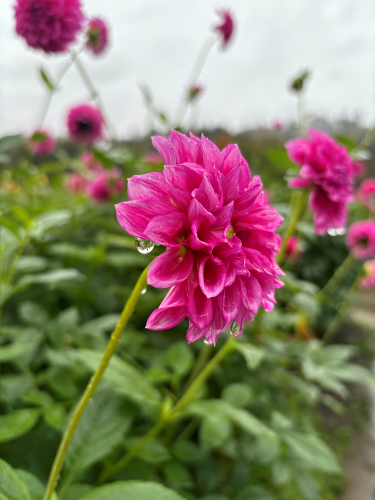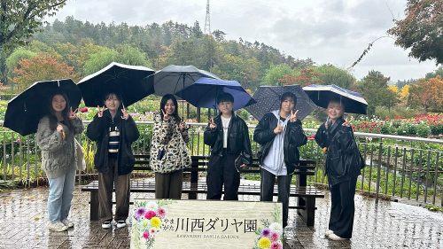 そして1日目の終わりはここ川西町のトレンドマークであるダリア園に向かいました。今の時期が満開のダリアは赤や黄、紫にピンクとどれも色濃く鮮やかに咲いていて思わず見惚れてしまいました。この日はあいにくの雨でしたが、花が水に滴る様子もとても綺麗で美しかったです。翌日にはこのダリアの花も「ダリア切り花収穫デー」で全て切り取られてしまっていたので、タイミングよくこの日に見られたのは本当に奇跡だったと思います。