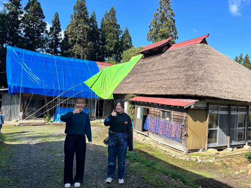 現地実習2日目の今日は、本間喜一先生のご自宅の茅葺き屋根の環境整備を行いました。