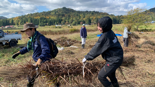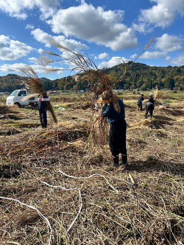 さてお腹と元気を満たしのち、午後の作業が再開されました!晴れた午後には茅の水分が抜けて軽くなっており、作業も午前以上に捗りました。作業をしているとぴょんぴょんと飛び出してくる蛙を発見したり、冷たい風の向こうに広がる山と青空の美しい景色を眺めたりと、豊かな自然を感じながら黙々と作業を続けていきました。