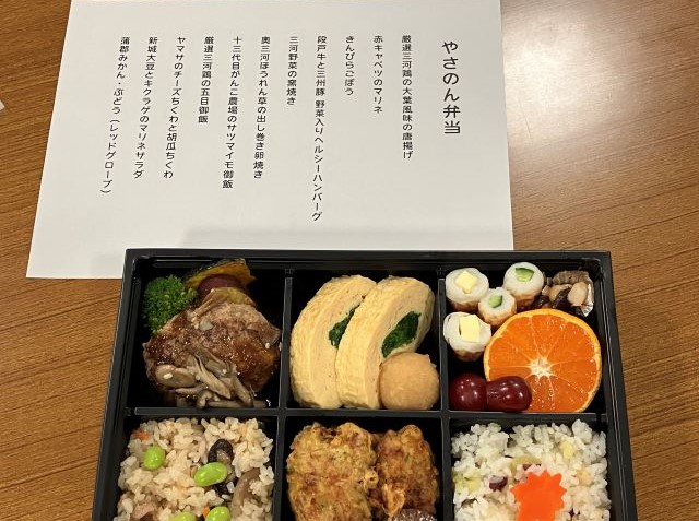 「やさのん弁当」は、東三河の良さを食材を通じて知ってほしい、子供にも野菜を食べてほしい、という思いから開発され、豊橋の方言で「おやこでやさいたべんかのん?」を略して名づけられたものです。
