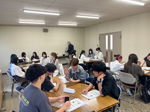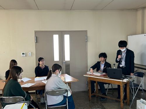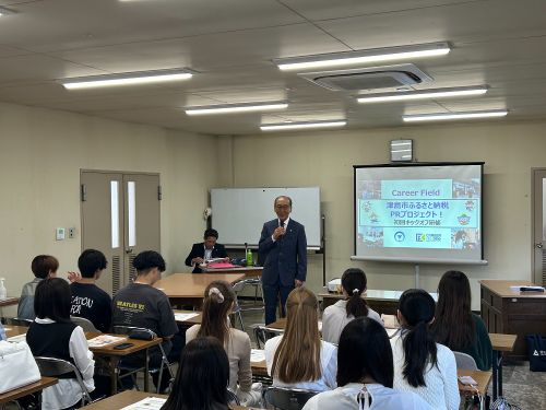 キックオフ研修では、津島市職員の方から「ふるさと納税制度」についてと、津島市のふるさと納税の実態や、どんな返礼品があるのかを教えてもらいました。そもそもふるさと納税とは何かといった初歩的なところから、この制度に馴染みのない学生にも分かりやすく教えていただき、皆真剣な表情でしっかりと聞いていました。