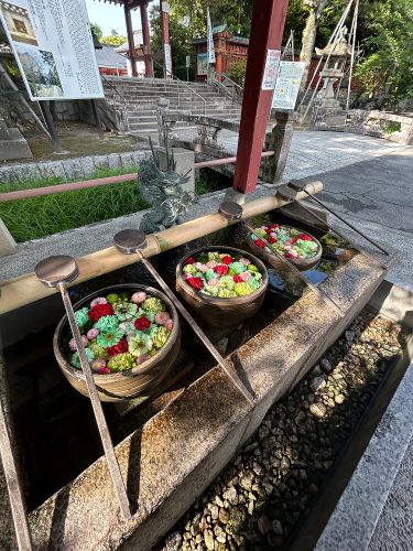 毎月1日と15日に色とりどりの花を飾っており、その時期にあったイメージの花を飾っています。私たちが訪問した際は、御田植祭をイメージした花手水でした!