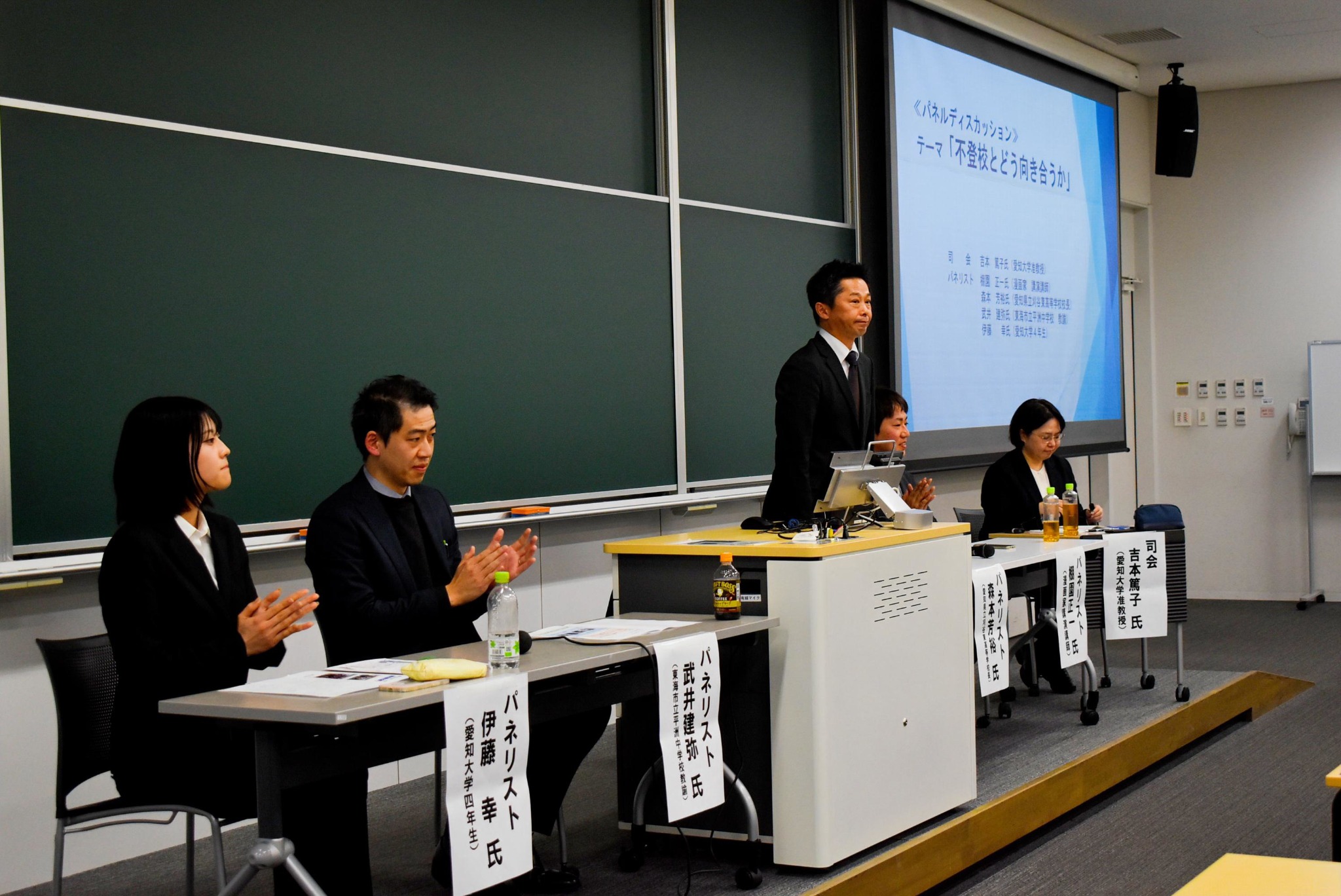 第二部では、棚園氏に加え、本校OBでもある愛知県立刈谷東高等学校校長の森本芳裕氏、東海市立平洲中学校教諭の武井建弥氏、そして、学生代表として愛知大学国際コミュニケーション学部4年生の伊藤幸さんをパネリストに迎え、パネルディスカッションを行いました。学校現場の不登校の現状や対応、さらにはいじめへの取組なども紹介され、不登校とどう向き合えばよいのかを会場の参加者とともに話し合うことができました。