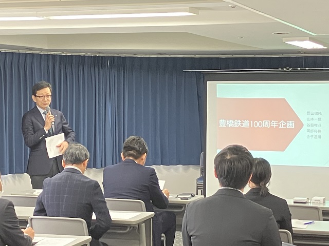 2024年3月7日(木)に「豊橋鉄道100周年 記念企画プロジェクト」3回目を実施しました。当日は豊橋鉄道株式会社社長小笠原敏彦様以下役員の皆様にお越しいただいて、これまで検討してきたプロジェクト案の発表を行いました。