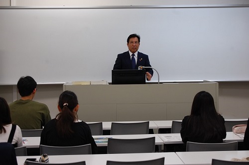豊橋キャンパスで2年生向けに開講している「キャリアデザイン特殊講義」、自治体の首長によるリレー講義の3回目は、田原市長の山下政良様に努めていただきました。