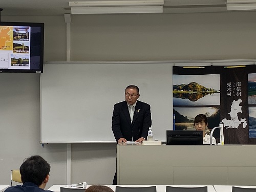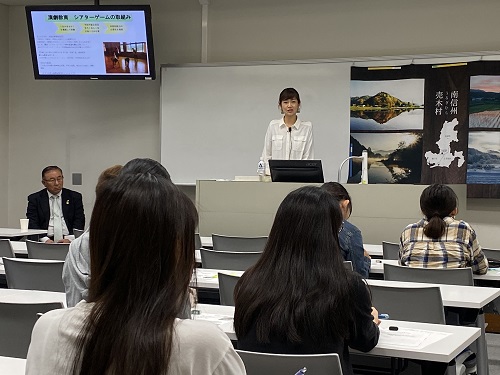 人口が長野県で2番目に少ない売木村において、「人口が少ないからこそ出来る村づくり」をテーマに講義をいただきました。また講義後半では、売木村で地域おこし協力隊として活動している女優の広田華さんも登壇され、活動内容の紹介や売木村の魅力について語っていただきました。