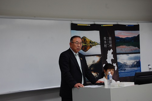 豊橋キャンパスで2年生向けに開講している「キャリアデザイン特殊講義」、自治体の首長によるリレー講義の5回目は、長野県売木村長の清水秀樹様に努めていただきました。