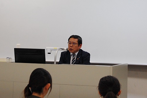 豊橋キャンパスで2年生向けに開講している「キャリアデザイン特殊講義」、自治体の首長によるリレー講義の7回目は、東栄町長の村上孝治様に努めていただきました。