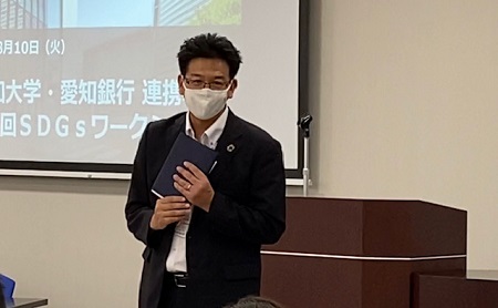 株式会社愛知銀行 法人営業部 地域連携グループ 坪井和之グループリーダーから、「SDGsの視点で愛知銀行が取り組むべきことへの提案について、我々では気が付かない視点での意見が出され参考になった。協力するだけで終わってしまってはSDGsの目標を実現できない。目標を実現するためには、連帯意識だけでなく、一人一人が自分事として行動していくことが大事。皆さんも自分ができることを考え、前向きに取り組んでいってほしい」との総括がなされ、ワークショップを閉じました。