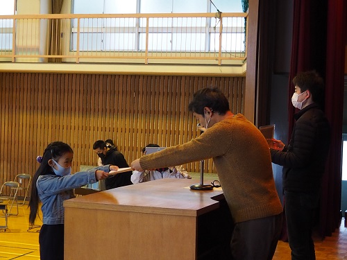 優秀作品に選ばれた9名の児童に、賞状をお渡しし、更に参加者全員に対して、特製下敷きと三遠ネオフェニックスの試合観戦ペアチケットをプレゼントしました。