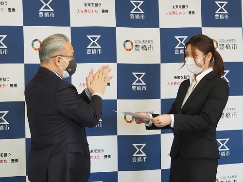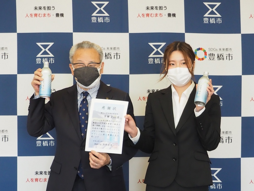 地域政策学部生考案のデザインが、豊橋市が製造・販売する飲用水のラベルデザインとして採用され、豊橋市長から感謝状を受け取りました。