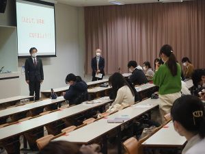 『「まちづくり」は「ひとづくり」「幸せづくり」』をテーマに、子ども子育て支援、高齢社会への対応、防災・環境対策、多文化共生への取り組みと課題についてお話しいただいたほか、学生に期待したいことについてご説明いただきました。