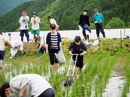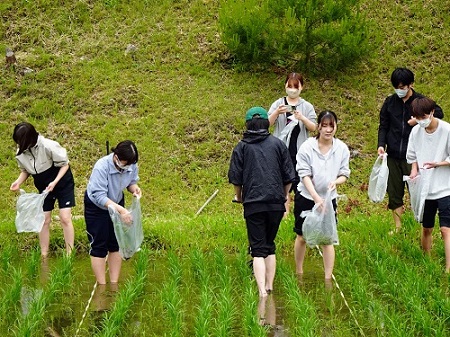 午前中は、5月に田植えを行った田んぼで除草作業に取り組みました。