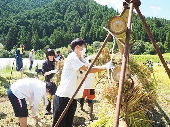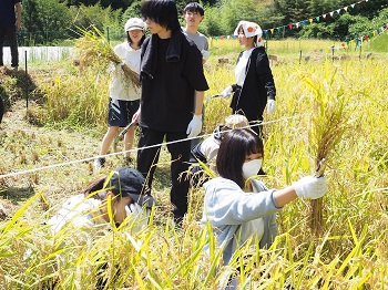 稲刈り(9月16日開催)では、5月に学生たちが植えたが稲を、村の方に指導をいただきながら稲刈りを行いました。
