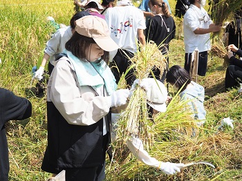 学生は自分たちが植えた苗が成長し、黄金色に実っている姿をみて感動していました。刈り取った稲は束ねて稲架して、2週間ほど乾燥させた後収穫されます。