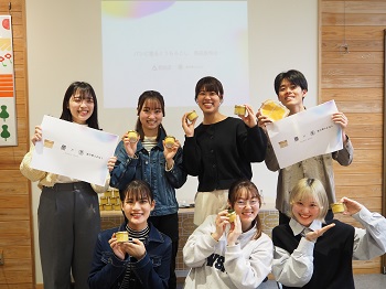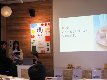 道の駅とよはしとの地域連携事業において、参加学生15名が2022年5月から約2年をかけて考案した新商品「パンに塗るとうもろこし」の販売が開始され、4月20日(土)に同施設にて商品発表会を行いました。