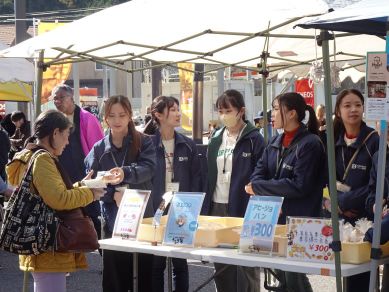 秋晴れに恵まれた秋色感謝祭当日、学生はまず朝6時半から、現地のパン職人の方々が実現してくださったパンの袋詰めを行いました。そして、秋色感謝祭開始(朝9時)とともに、愛知大学のブースにおいて、パンの販売を開始しました。対象のパンは、学生がチームごとにレシピを考案した、「うるのすけのふわふわちぎりパン」「ミョウガピロシキ」「アヒージョパン」「トマトとチーズのカンパーニュ」の4種類です。商品紹介のポップも学生の手作りです。学生の明るく積極的な呼び掛けと、地域の特産物を活かした見るからに美味しそうなパンの陳列に、多くの方々が足を止め、見入り、購入してくださいました。4種類のパンいずれもバランスよく売れていき、なんと販売開始わずか1時間半後の10時半には、完売となりました。これには、学生もたいそう驚くとともに、喜びました。学生はその後、別のブースの見学をしたり、ミニコンサートや投げ餅等のイベントを楽しみました。