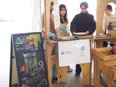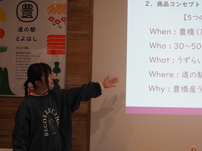 道の駅とよはしとの地域連携事業において、参加学生12名が2023年4月から約1年半かけて考案した新商品「塗って焼くとよはしうずらいもバター」の販売が開始され、2月1日(土)に同施設にて商品発表会を行いました。