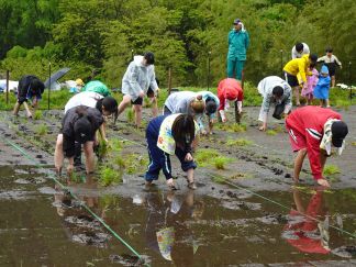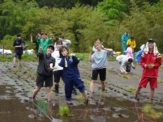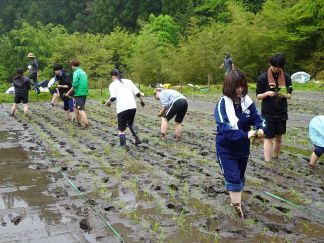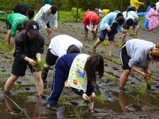 5月8日の学内でのキックオフ研修を経て、5月10日、学生10人は豊根村に向かいました。あいにくの小雨模様の中、学生は、田んぼのぬかるみに足をとられてバランスが崩れる等悪戦苦闘しながらも、互いに励まし合いながら、元気に田植え作業に取り組みました。田植え初心者の多い学生たちにとって、苗をまっすぐに植えるということは、なかなか難しかったようです。