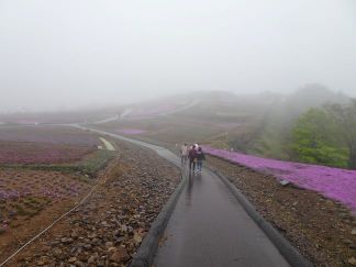 午後は、豊根村役場の課題ともなっている茶臼山高原に出かけました。一面の霧と降ったりやんだりの小雨という天候、そして高原観光の目玉である芝桜も4分咲程度、という必ずしも恵まれた状況ではなかったものの、それらを吹っ飛ばすかのように学生たちは活発に高原を歩き回りました。そして、課題である野外活動ロッジの跡地では皆、じっくり時間をかけて現場と周囲を観察し、互いに意見を交わしていました。