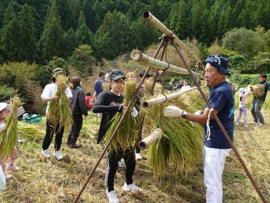 田んぼが一面黄金色に輝く中、学生は指導員のレクチャーを受けながら、稲刈りと「はさがけ」の作業を体験しました。稲刈りにおいては、鎌で稲を刈るグループと、刈った稲を束ねるグループに分かれて、効率的に作業を進めました。「はさがけ」とは、物干しざおのような木組みに、刈った稲穂を掛け、太陽の光でもみを乾燥させる伝統的な手法です。学生たちは、近代的な乾燥機を使わない乾燥工程に驚嘆しつつも楽しんで取り組むとともに、米作りの大変さも改めて実感していました。