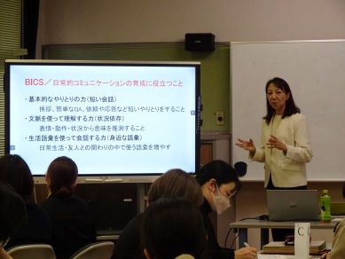 2025年7月に、本学と日本赤十字社愛知県支部は、連携に関する包括協定を締結しました。連携活動の一環として、12月19日に高村めぐみ国際コミュニケーション学部教授が、知多市内の外国人児童生徒教育担当者(小・中学校や日本語教室の教職員等)22人を対象に、知多市立つつじが丘小学校において、「外国人児童生徒に対する日本語の指導方法」の研修を実施しました。