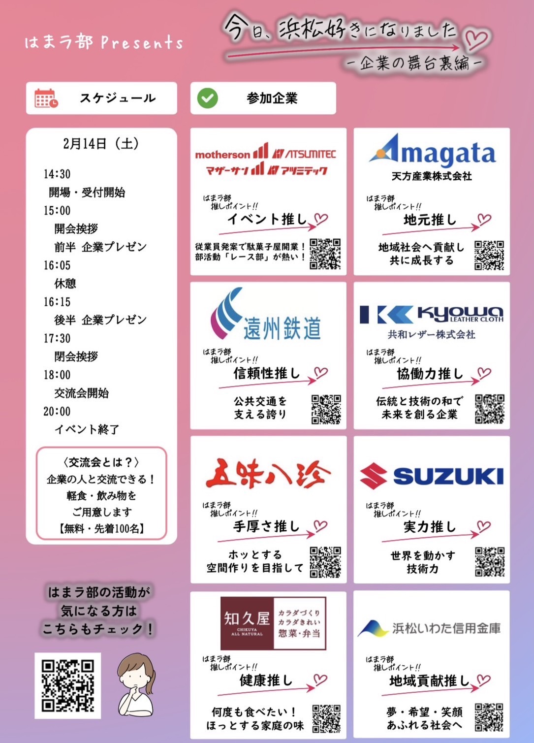 2026年2月14日(土)、地域政策学部の学生らでつくる学生地域貢献事業団体「はまラ部」は、浜松市の後援のもと、同市の企業の魅力を学生に発信するイベント「今日、浜松好きになりましたー企業の舞台裏編―」を浜松市地域情報センターで開催しました。