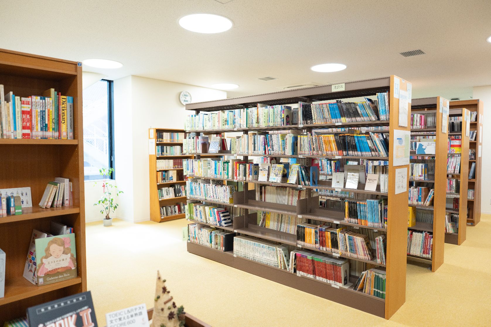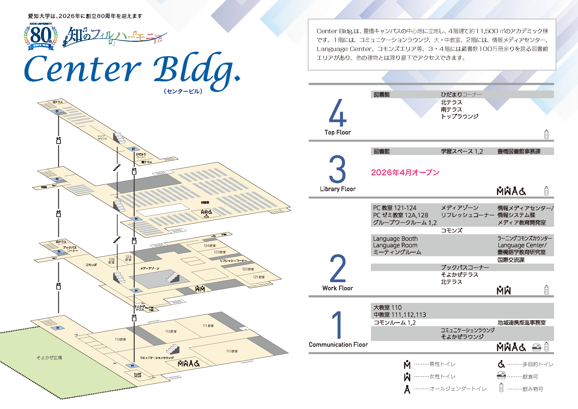 【4階:Top Floor】▸東西南北に窓があり高木や、そよかぜ広場の天然芝、築約120年の旧陸軍15師団の明治近代建築、東には湖西連峰、 3Fの集密書架など、自然と調和したキャンパスを見下ろすことができて創立80周年の本学の歴史と伝統を感じ取れる空間